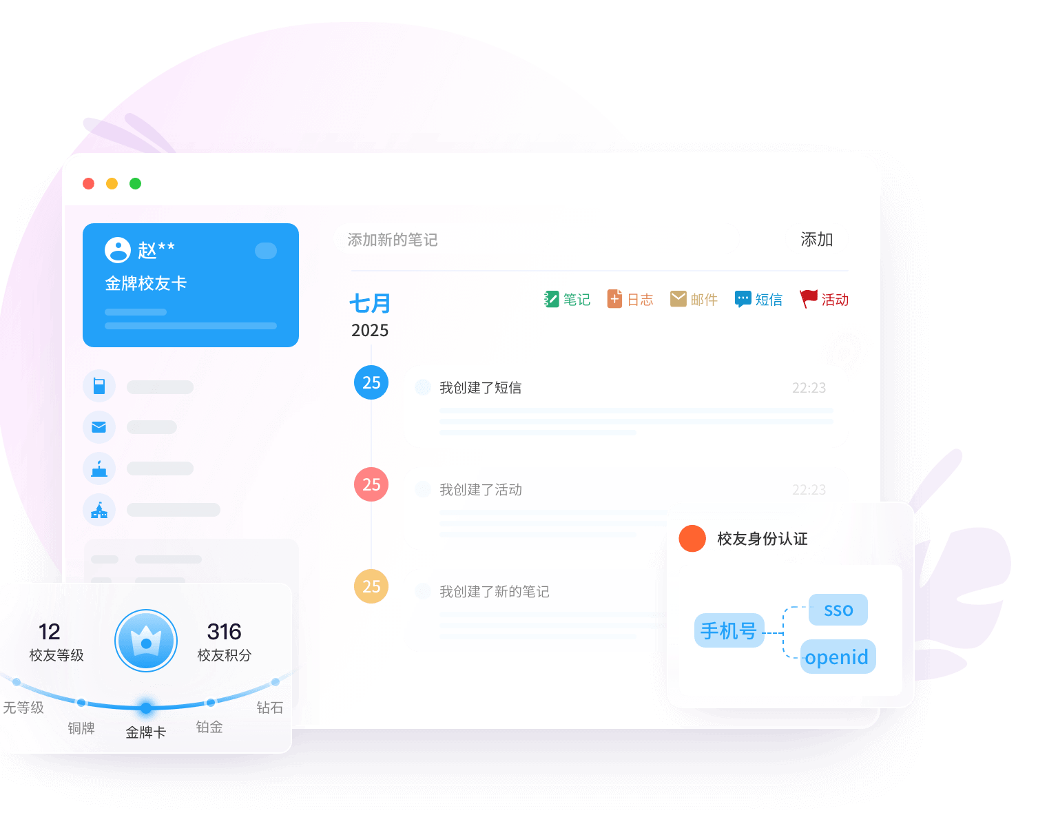 平台支持接入微信、SSO、手机号等多重身份体系,为教育机构快速搭建师生、校友服务系统,包含用户注册、信息管理、积分、用户等级等。